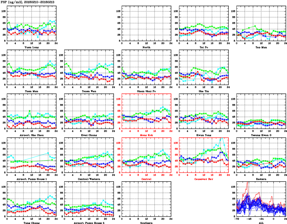 | Air Quality Data Time Series for FSP (2018/02/13) | ( Line colors: Day -3 Day -2 Day -1 Current day ) | 2D Map Current AQHI |