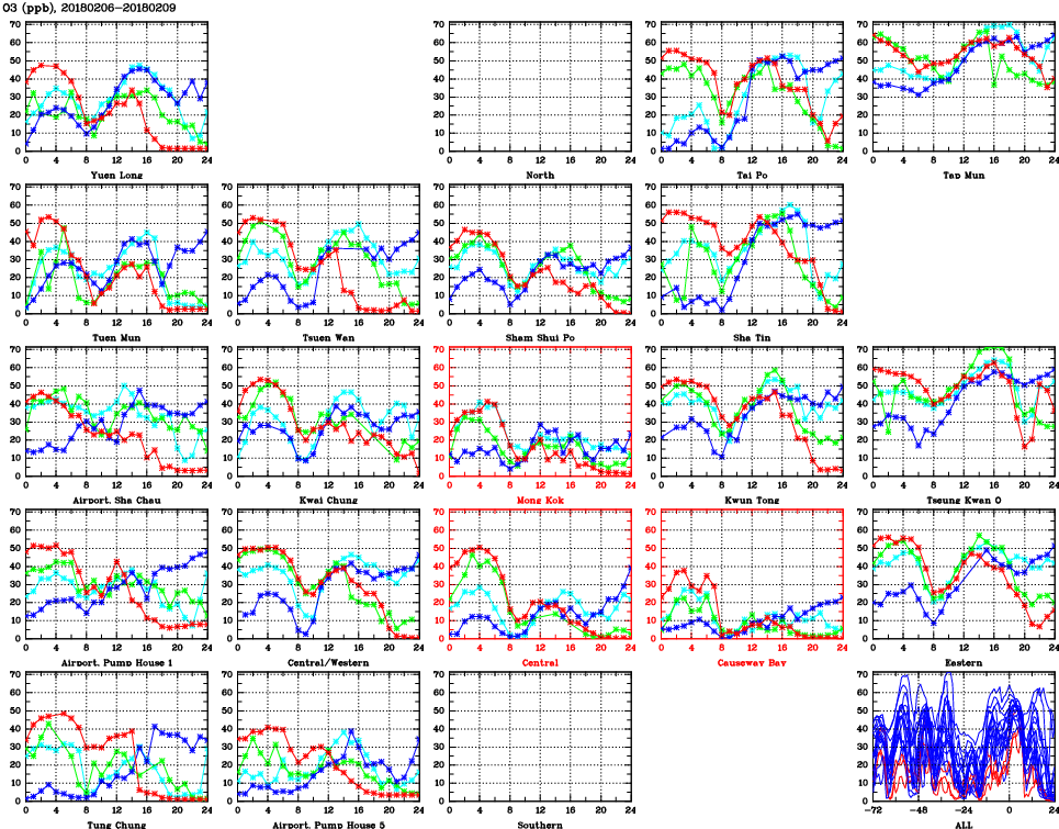 | Air Quality Data Time Series for O3 (2018/02/09) | ( Line colors: Day -3 Day -2 Day -1 Current day ) | 2D Map Current AQHI |