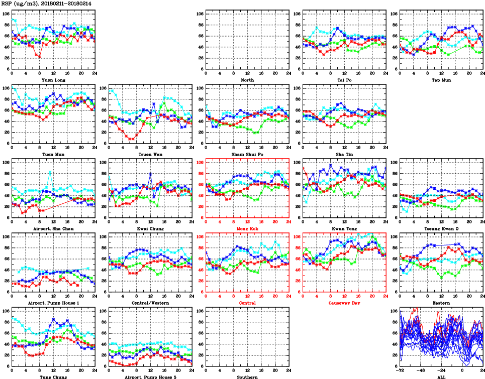 | Air Quality Data Time Series for RSP (2018/02/14) | ( Line colors: Day -3 Day -2 Day -1 Current day ) | 2D Map Current AQHI |