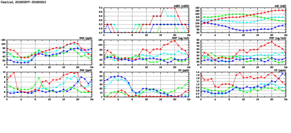 | Air Quality Data Time Series in Central (2018/02/10) | ( Line colors: Day -3 Day -2 Day -1 Current day ) | 2D Map Current AQHI |