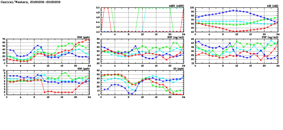 | Air Quality Data Time Series in Central/Western (2018/02/09) | ( Line colors: Day -3 Day -2 Day -1 Current day ) | 2D Map Current AQHI |