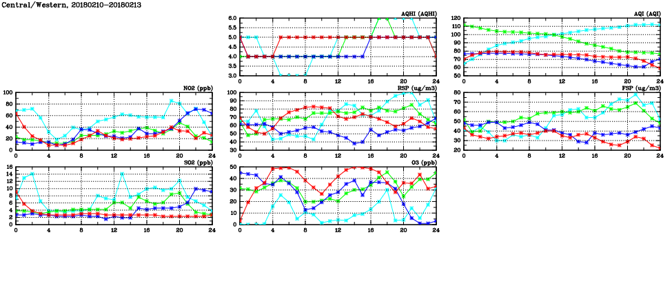 | Air Quality Data Time Series in Central/Western (2018/02/13) | ( Line colors: Day -3 Day -2 Day -1 Current day ) | 2D Map Current AQHI |