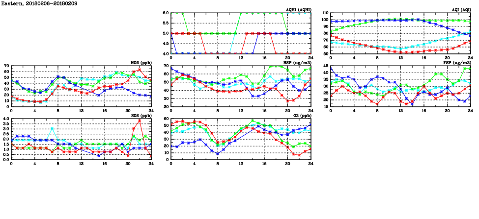 | Air Quality Data Time Series in Eastern (2018/02/09) | ( Line colors: Day -3 Day -2 Day -1 Current day ) | 2D Map Current AQHI |