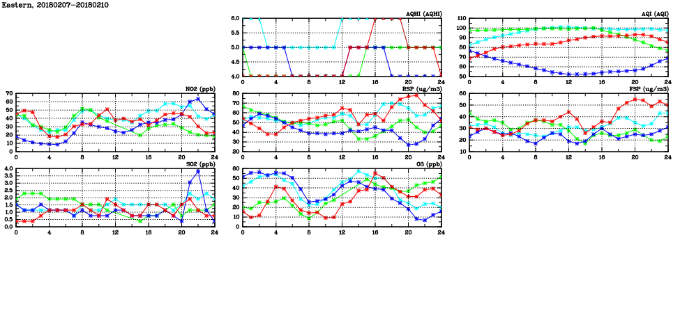 | Air Quality Data Time Series in Eastern (2018/02/10) | ( Line colors: Day -3 Day -2 Day -1 Current day ) | 2D Map Current AQHI |