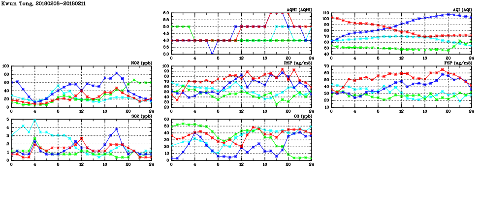 | Air Quality Data Time Series in Kwun Tong (2018/02/11) | ( Line colors: Day -3 Day -2 Day -1 Current day ) | 2D Map Current AQHI |