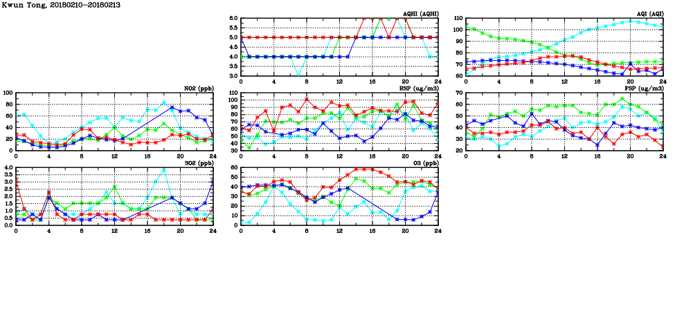 | Air Quality Data Time Series in Kwun Tong (2018/02/13) | ( Line colors: Day -3 Day -2 Day -1 Current day ) | 2D Map Current AQHI |