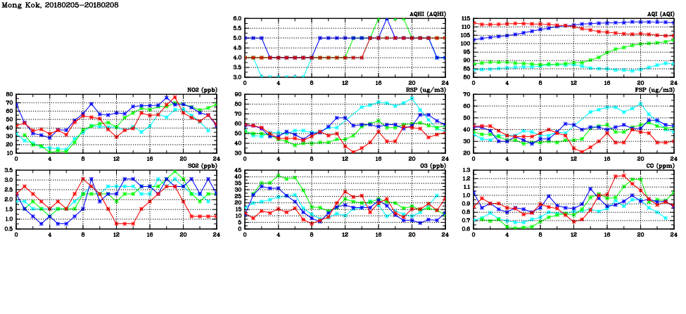 | Air Quality Data Time Series in Mong Kok (2018/02/08) | ( Line colors: Day -3 Day -2 Day -1 Current day ) | 2D Map Current AQHI |