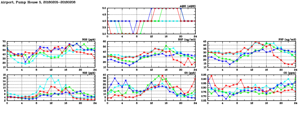 | Air Quality Data Time Series in Airport, Pump House 5 (2018/02/08) | ( Line colors: Day -3 Day -2 Day -1 Current day ) | 2D Map Current AQHI |