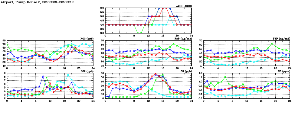 | Air Quality Data Time Series in Airport, Pump House 5 (2018/02/12) | ( Line colors: Day -3 Day -2 Day -1 Current day ) | 2D Map Current AQHI |