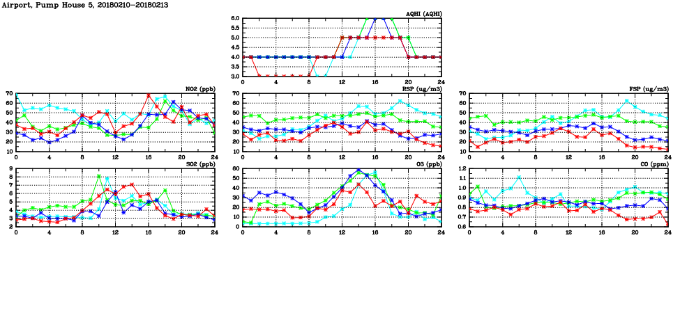 | Air Quality Data Time Series in Airport, Pump House 5 (2018/02/13) | ( Line colors: Day -3 Day -2 Day -1 Current day ) | 2D Map Current AQHI |