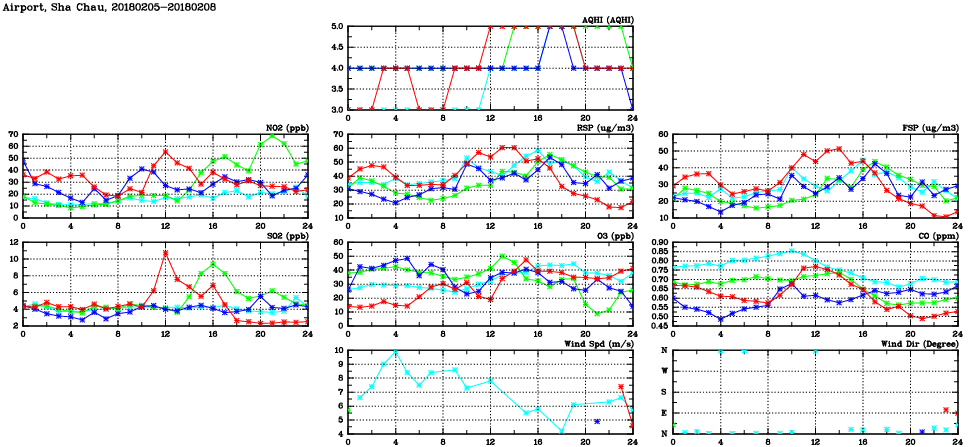 | Air Quality Data Time Series in Airport, Sha Chau (2018/02/08) | ( Line colors: Day -3 Day -2 Day -1 Current day ) | 2D Map Current AQHI |
