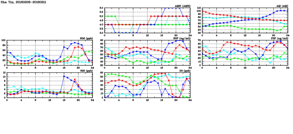 | Air Quality Data Time Series in Sha Tin (2018/02/11) | ( Line colors: Day -3 Day -2 Day -1 Current day ) | 2D Map Current AQHI |
