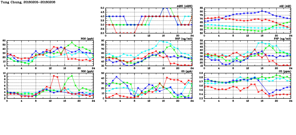 | Air Quality Data Time Series in Tung Chung (2018/02/08) | ( Line colors: Day -3 Day -2 Day -1 Current day ) | 2D Map Current AQHI |
