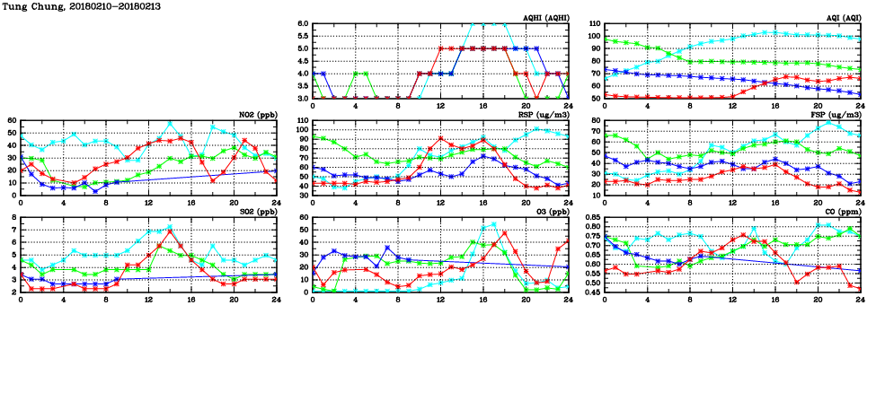 | Air Quality Data Time Series in Tung Chung (2018/02/13) | ( Line colors: Day -3 Day -2 Day -1 Current day ) | 2D Map Current AQHI |