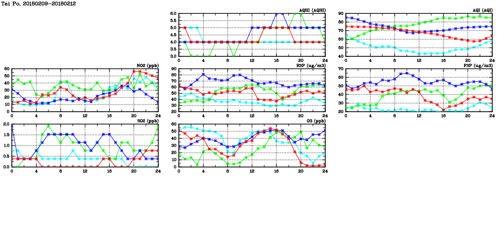 | Air Quality Data Time Series in Tai Po (2018/02/12) | ( Line colors: Day -3 Day -2 Day -1 Current day ) | 2D Map Current AQHI |