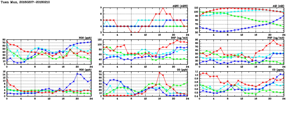 | Air Quality Data Time Series in Tuen Mun (2018/02/10) | ( Line colors: Day -3 Day -2 Day -1 Current day ) | 2D Map Current AQHI |