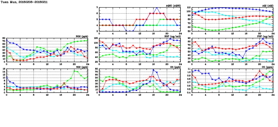 | Air Quality Data Time Series in Tuen Mun (2018/02/11) | ( Line colors: Day -3 Day -2 Day -1 Current day ) | 2D Map Current AQHI |
