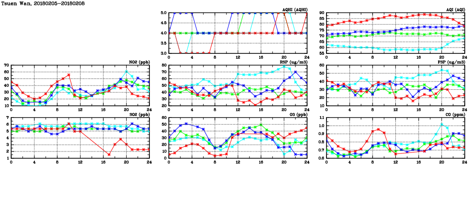 | Air Quality Data Time Series in Tsuen Wan (2018/02/08) | ( Line colors: Day -3 Day -2 Day -1 Current day ) | 2D Map Current AQHI |
