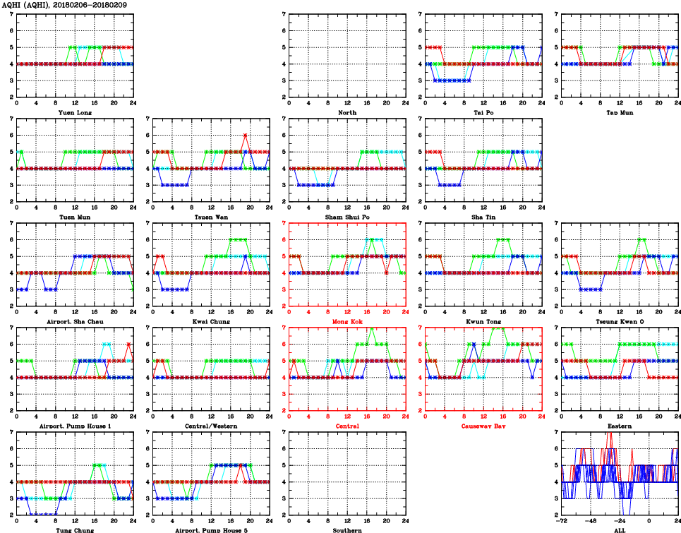 | Air Quality Data Time Series for AQHI (2018/02/09) | ( Line colors: Day -3 Day -2 Day -1 Current day ) | 2D Map Current AQHI |