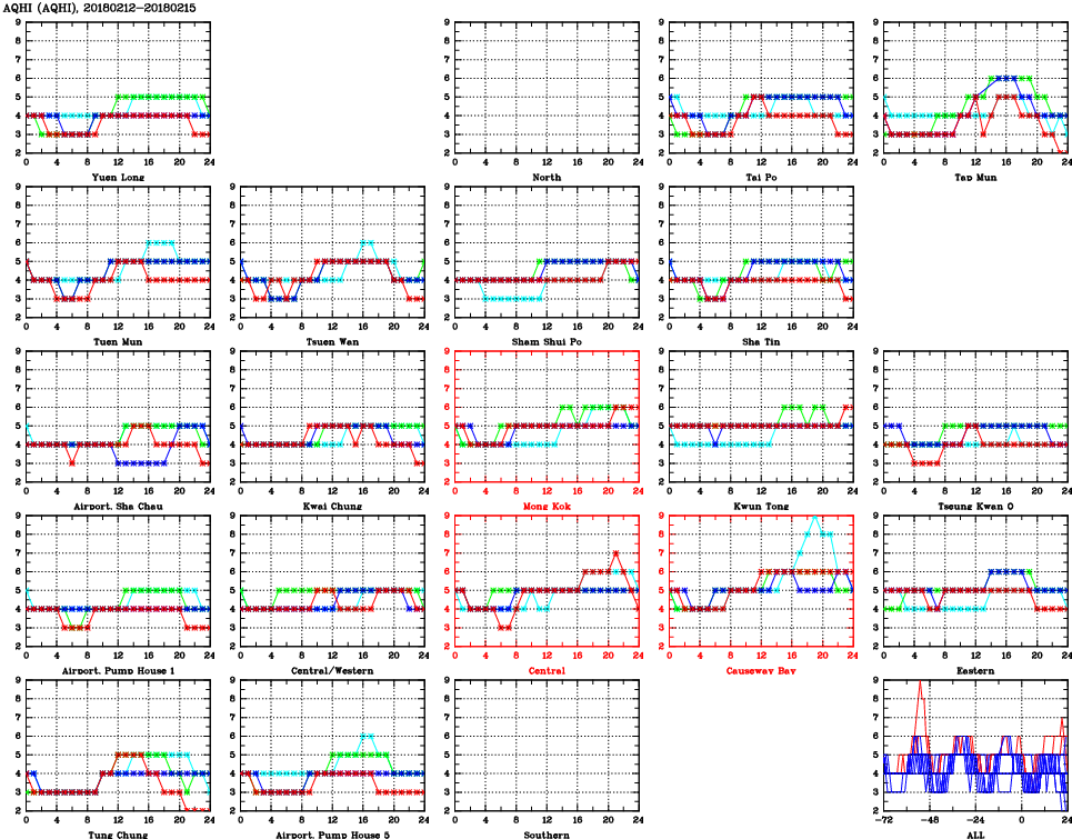 | Air Quality Data Time Series for AQHI (2018/02/15) | ( Line colors: Day -3 Day -2 Day -1 Current day ) | 2D Map Current AQHI |