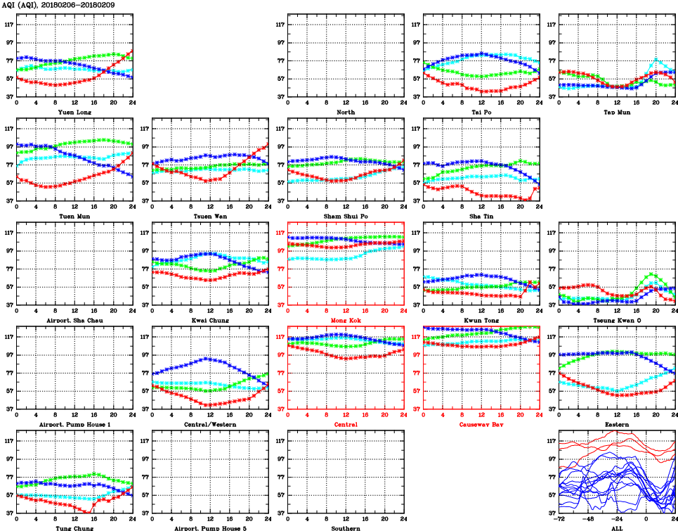 | Air Quality Data Time Series for AQI (2018/02/09) | ( Line colors: Day -3 Day -2 Day -1 Current day ) | 2D Map Current AQHI |