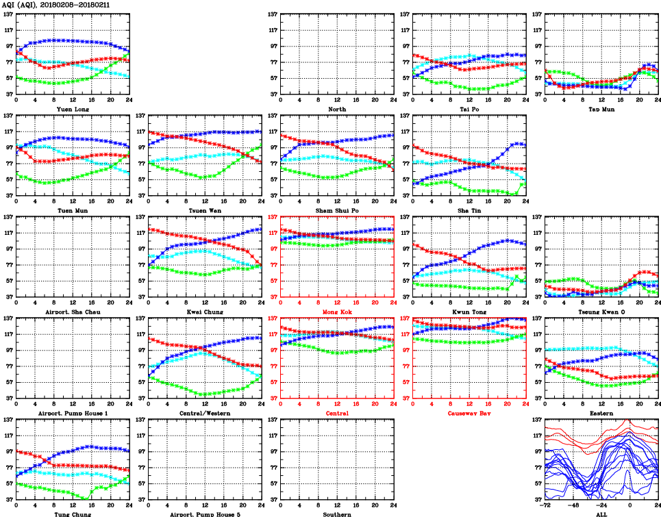 | Air Quality Data Time Series for AQI (2018/02/11) | ( Line colors: Day -3 Day -2 Day -1 Current day ) | 2D Map Current AQHI |