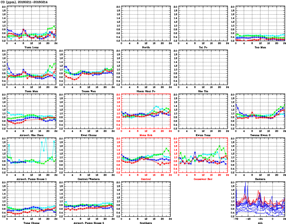 | Air Quality Data Time Series for CO (2018/02/14) | ( Line colors: Day -3 Day -2 Day -1 Current day ) | 2D Map Current AQHI |
