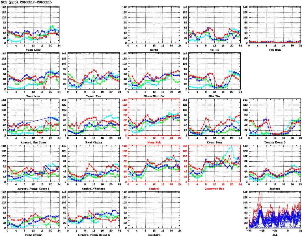 | Air Quality Data Time Series for NO2 (2018/02/15) | ( Line colors: Day -3 Day -2 Day -1 Current day ) | 2D Map Current AQHI |