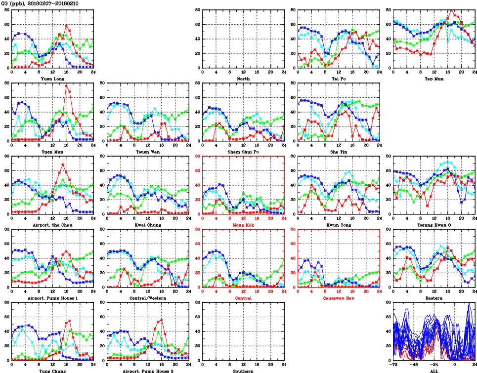 | Air Quality Data Time Series for O3 (2018/02/10) | ( Line colors: Day -3 Day -2 Day -1 Current day ) | 2D Map Current AQHI |