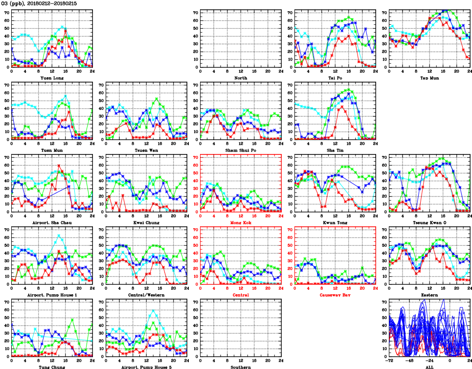 | Air Quality Data Time Series for O3 (2018/02/15) | ( Line colors: Day -3 Day -2 Day -1 Current day ) | 2D Map Current AQHI |