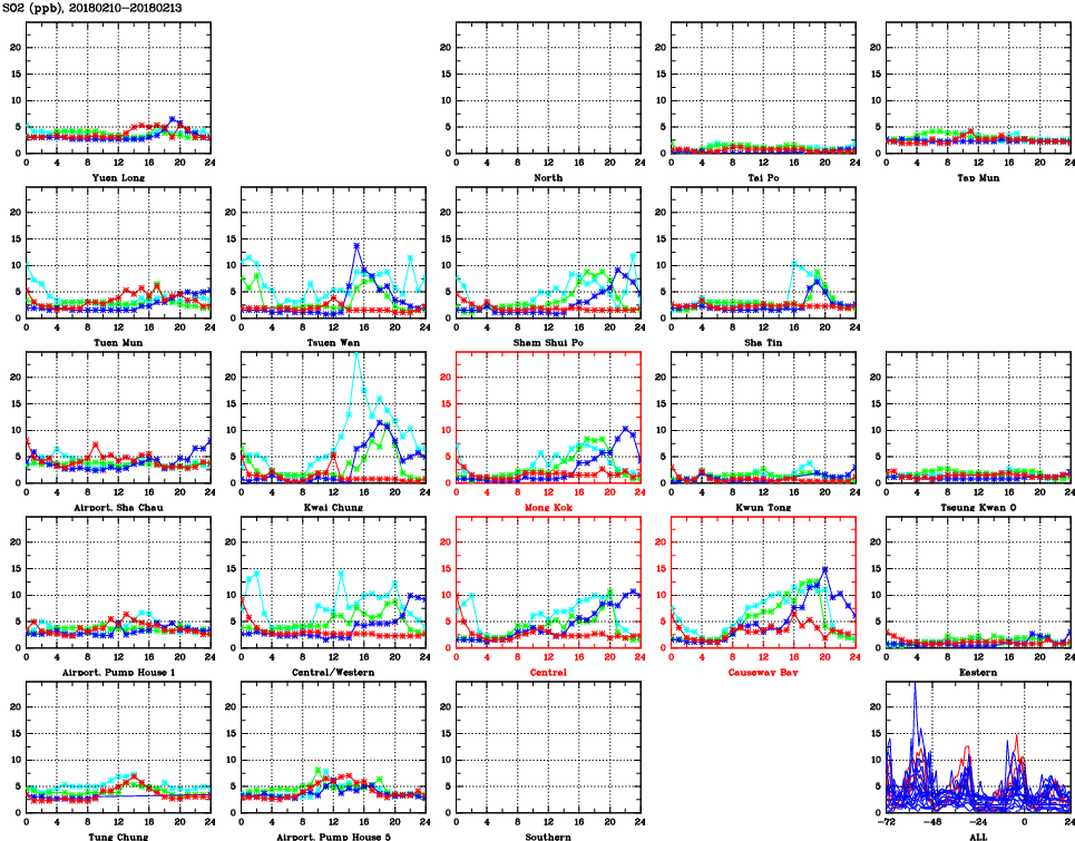 | Air Quality Data Time Series for SO2 (2018/02/13) | ( Line colors: Day -3 Day -2 Day -1 Current day ) | 2D Map Current AQHI |