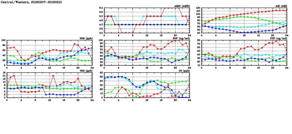 | Air Quality Data Time Series in Central/Western (2018/02/10) | ( Line colors: Day -3 Day -2 Day -1 Current day ) | 2D Map Current AQHI |