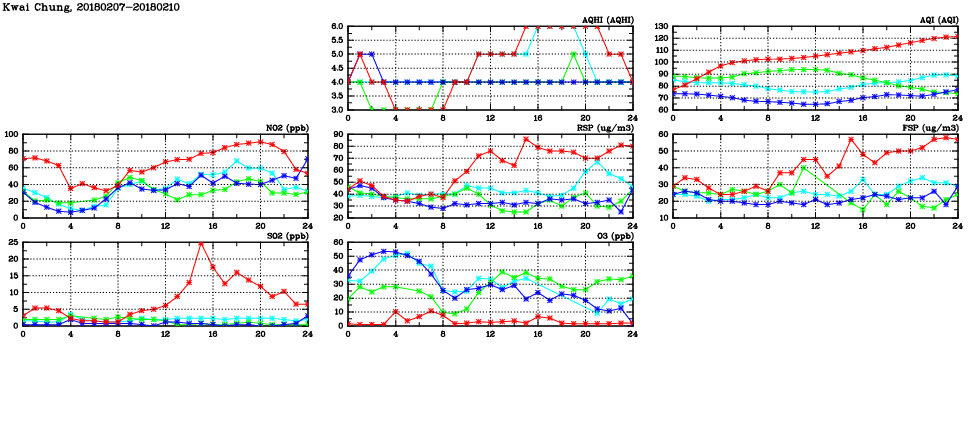 | Air Quality Data Time Series in Kwai Chung (2018/02/10) | ( Line colors: Day -3 Day -2 Day -1 Current day ) | 2D Map Current AQHI |