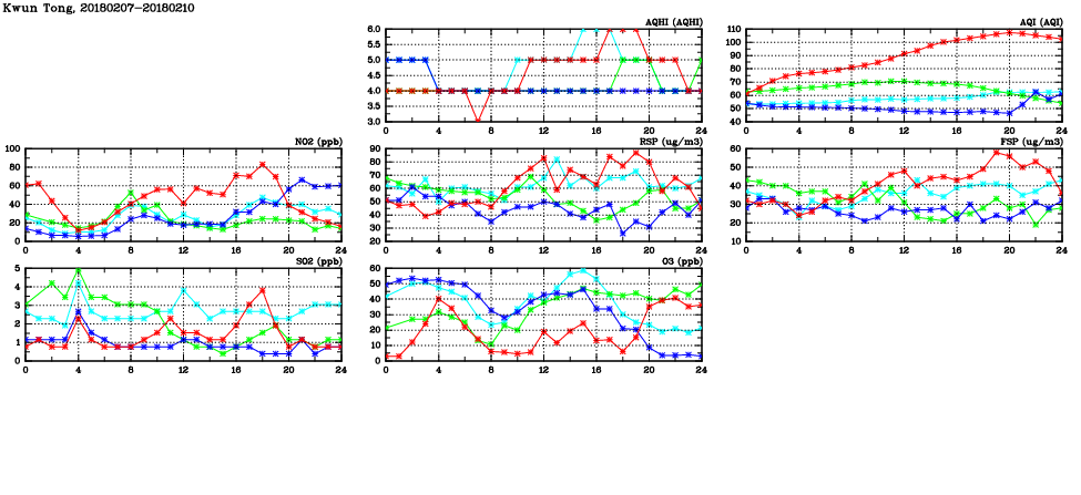 | Air Quality Data Time Series in Kwun Tong (2018/02/10) | ( Line colors: Day -3 Day -2 Day -1 Current day ) | 2D Map Current AQHI |