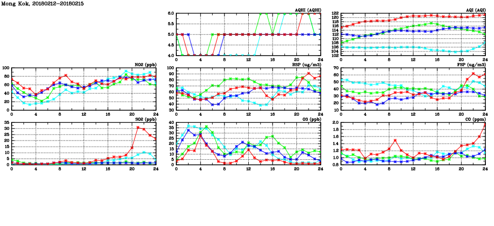 | Air Quality Data Time Series in Mong Kok (2018/02/15) | ( Line colors: Day -3 Day -2 Day -1 Current day ) | 2D Map Current AQHI |