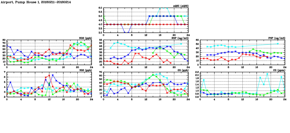 | Air Quality Data Time Series in Airport, Pump House 1 (2018/02/14) | ( Line colors: Day -3 Day -2 Day -1 Current day ) | 2D Map Current AQHI |