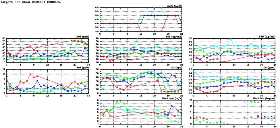 | Air Quality Data Time Series in Airport, Sha Chau (2018/02/14) | ( Line colors: Day -3 Day -2 Day -1 Current day ) | 2D Map Current AQHI |