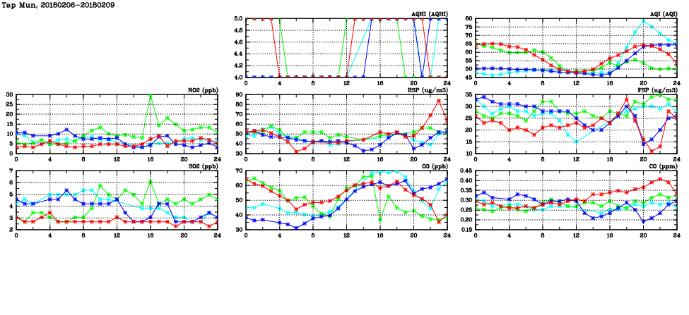| Air Quality Data Time Series in Tap Mun (2018/02/09) | ( Line colors: Day -3 Day -2 Day -1 Current day ) | 2D Map Current AQHI |