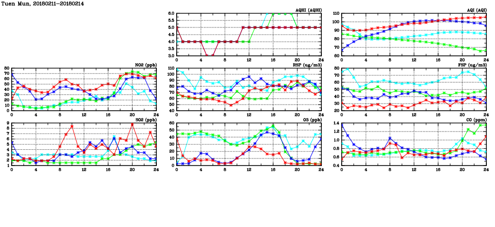 | Air Quality Data Time Series in Tuen Mun (2018/02/14) | ( Line colors: Day -3 Day -2 Day -1 Current day ) | 2D Map Current AQHI |