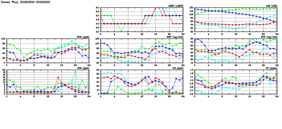 | Air Quality Data Time Series in Tsuen Wan (2018/02/12) | ( Line colors: Day -3 Day -2 Day -1 Current day ) | 2D Map Current AQHI |