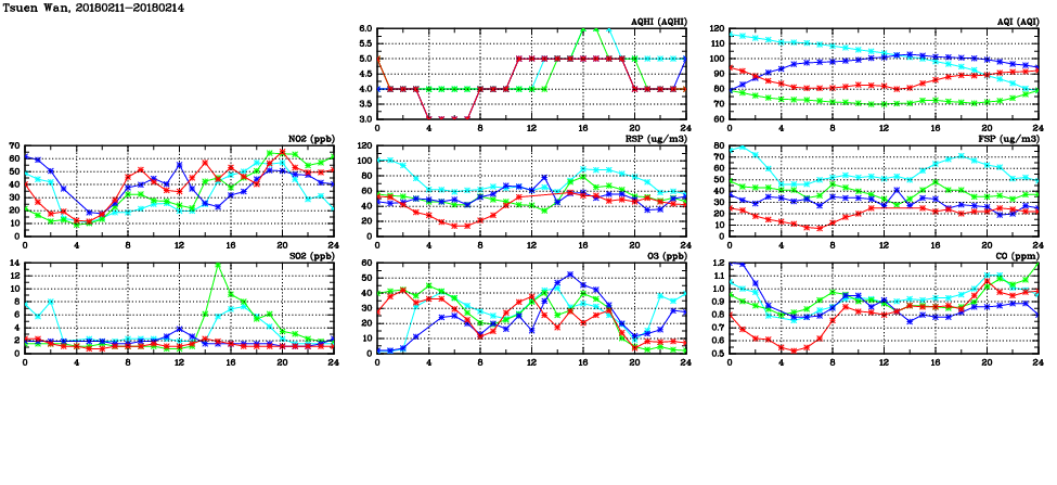 | Air Quality Data Time Series in Tsuen Wan (2018/02/14) | ( Line colors: Day -3 Day -2 Day -1 Current day ) | 2D Map Current AQHI |