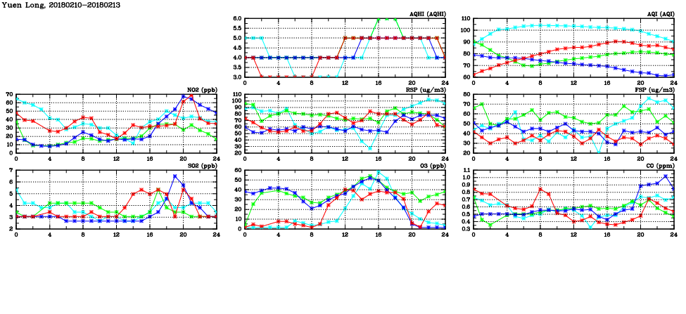 | Air Quality Data Time Series in Yuen Long (2018/02/13) | ( Line colors: Day -3 Day -2 Day -1 Current day ) | 2D Map Current AQHI |