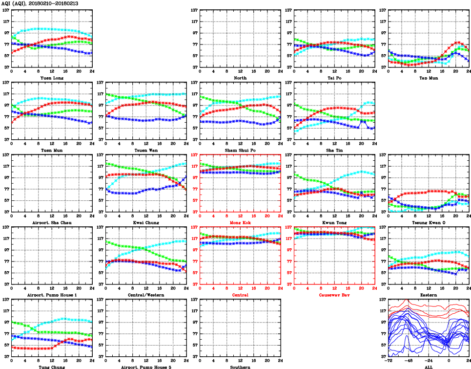 | Air Quality Data Time Series for AQI (2018/02/13) | ( Line colors: Day -3 Day -2 Day -1 Current day ) | 2D Map Current AQHI |