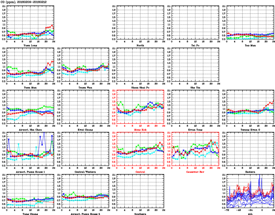 | Air Quality Data Time Series for CO (2018/02/12) | ( Line colors: Day -3 Day -2 Day -1 Current day ) | 2D Map Current AQHI |