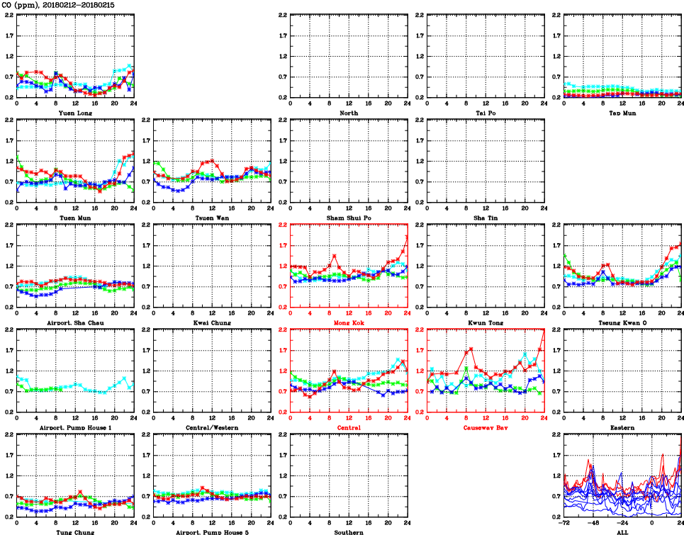 | Air Quality Data Time Series for CO (2018/02/15) | ( Line colors: Day -3 Day -2 Day -1 Current day ) | 2D Map Current AQHI |