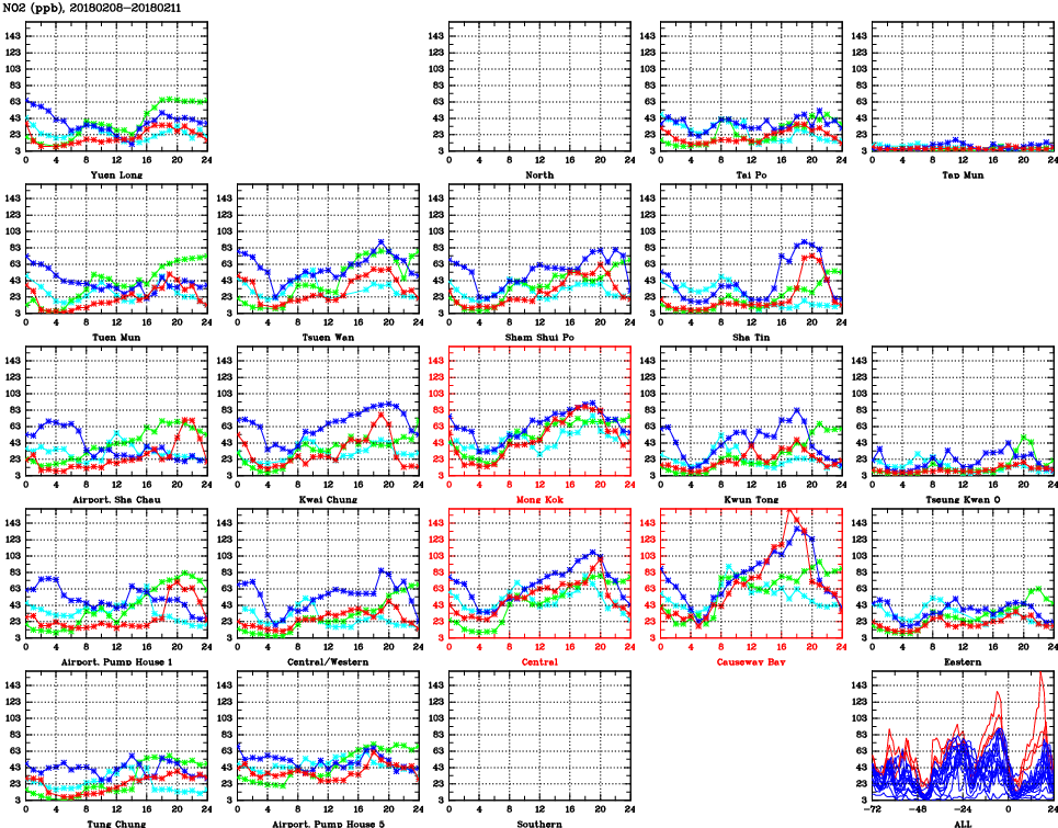 | Air Quality Data Time Series for NO2 (2018/02/11) | ( Line colors: Day -3 Day -2 Day -1 Current day ) | 2D Map Current AQHI |