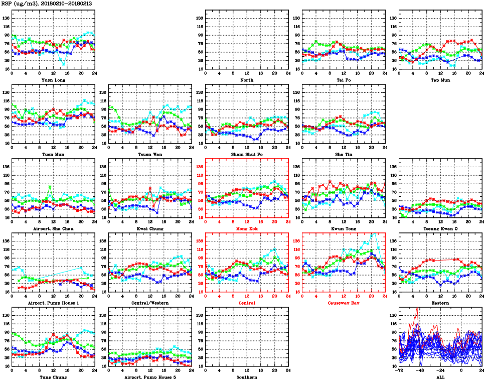 | Air Quality Data Time Series for RSP (2018/02/13) | ( Line colors: Day -3 Day -2 Day -1 Current day ) | 2D Map Current AQHI |