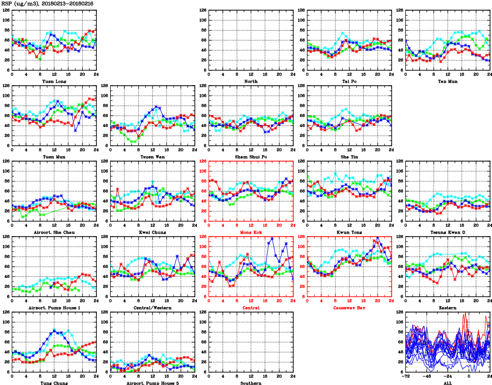 | Air Quality Data Time Series for RSP (2018/02/16) | ( Line colors: Day -3 Day -2 Day -1 Current day ) | 2D Map Current AQHI |