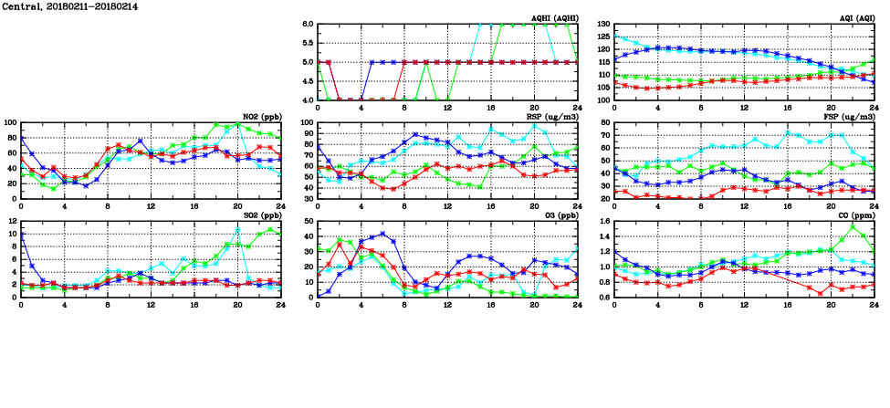 | Air Quality Data Time Series in Central (2018/02/14) | ( Line colors: Day -3 Day -2 Day -1 Current day ) | 2D Map Current AQHI |