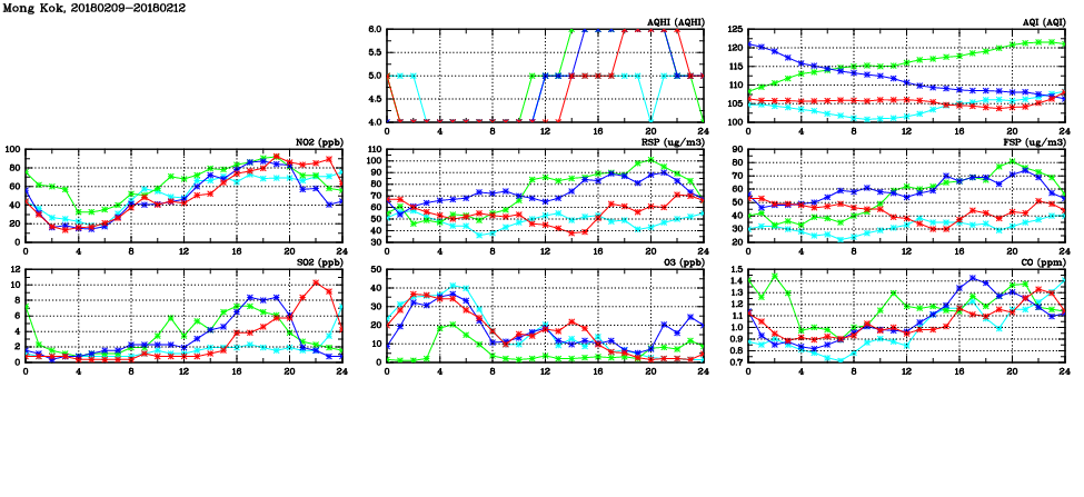 | Air Quality Data Time Series in Mong Kok (2018/02/12) | ( Line colors: Day -3 Day -2 Day -1 Current day ) | 2D Map Current AQHI |